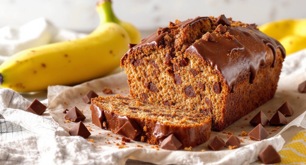 Craquez pour ce banana bread aux pépites de chocolat, un cake moelleux et parfumé pour 6 personnes. Idéal pour le goûter ou le petit-déjeuner, il transforme vos bananes trop mûres en un dessert irrésistible parsemé de pépites fondantes.